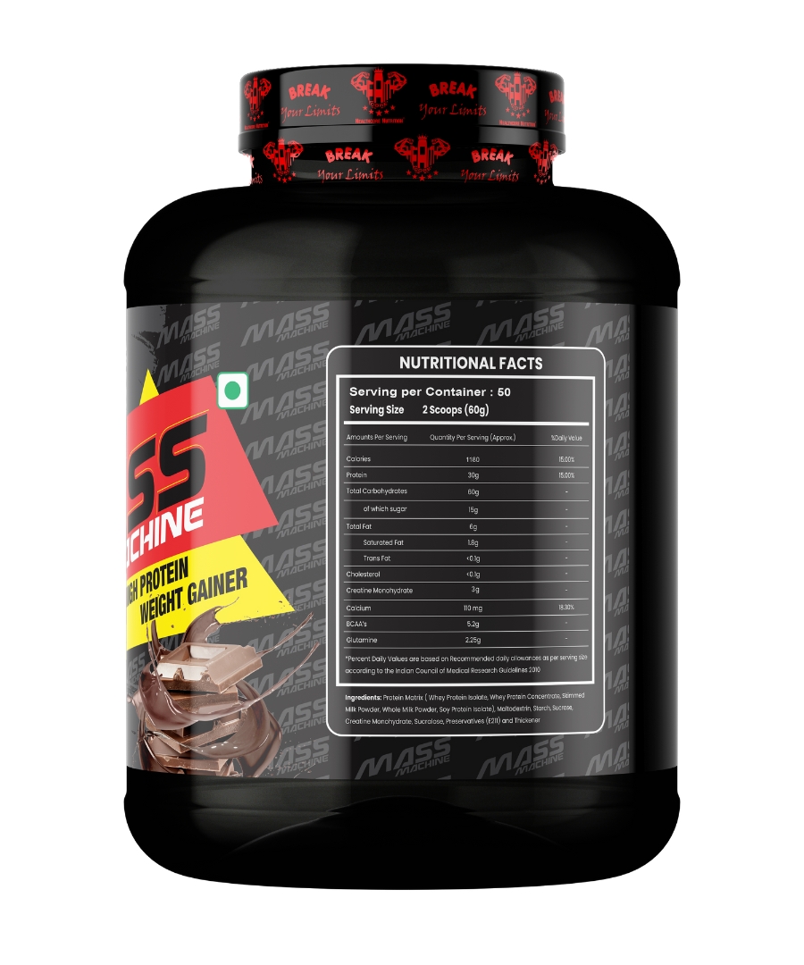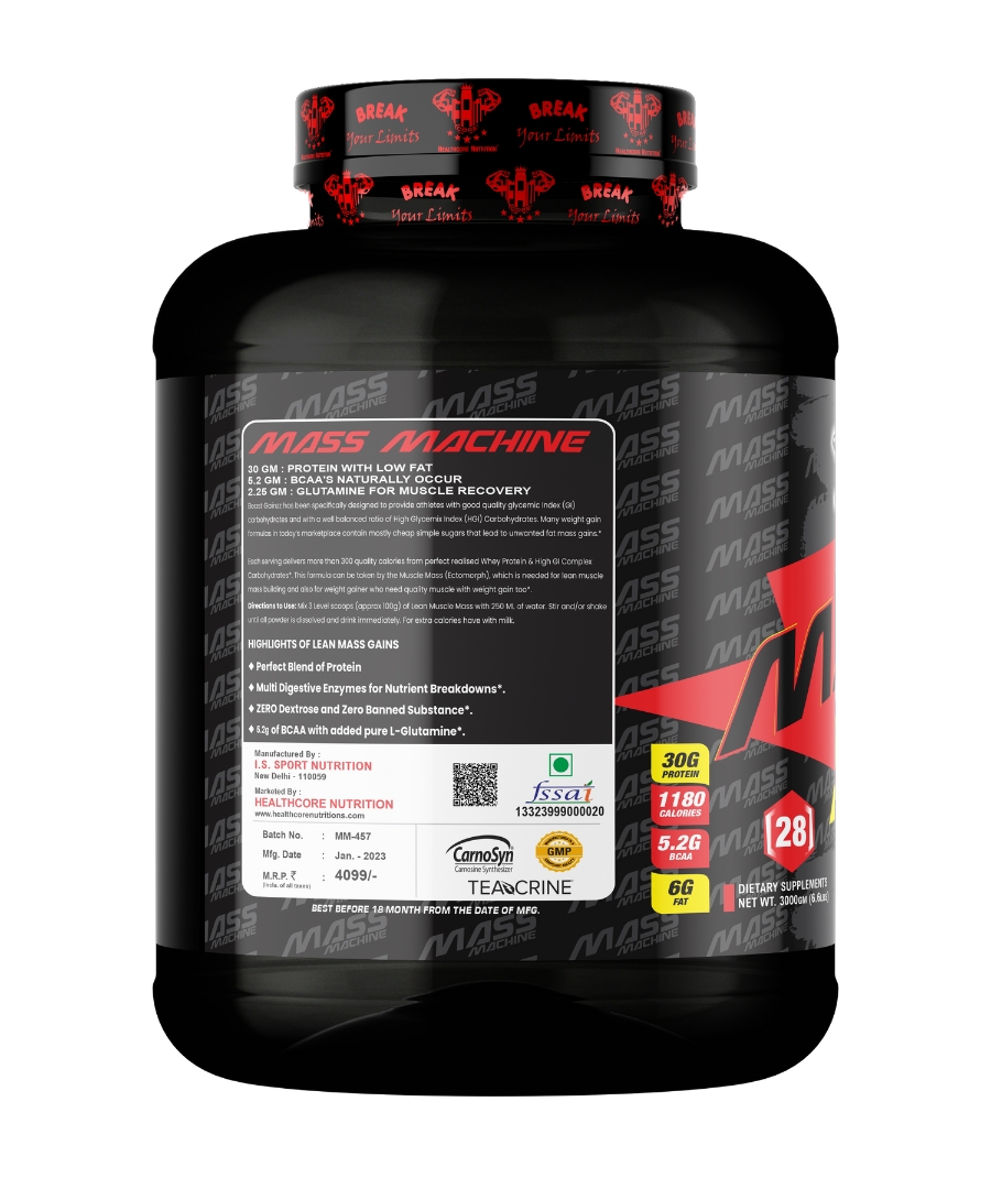 Health Core Nutrition Mass Machine is an advanced and effective weight gain supplement. It helps in the synthesis of new muscle gains and prevent post workout muscle loss. Added digestive enzymes helps in quick digestion of nutrients. Each serving provides 30 grams of protein and 1180 calories.