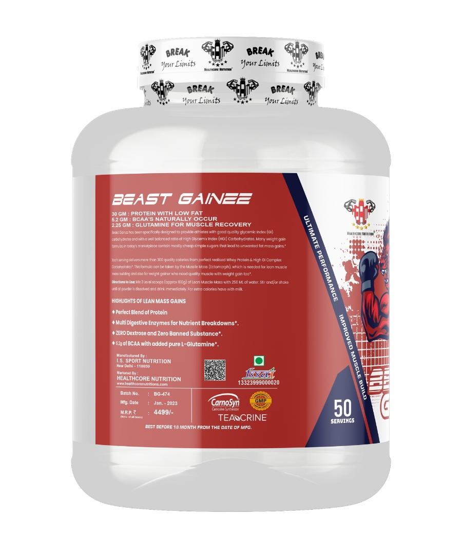 Health Core Nutrition Beast Gains is an advanced and effective weight gain supplement. It helps in the synthesis of new muscle gains and prevent post workout muscle loss. Added digestive enzymes helps in quick digestion of nutrients. Each serving provides 30 grams of protein and 1180 calories.
