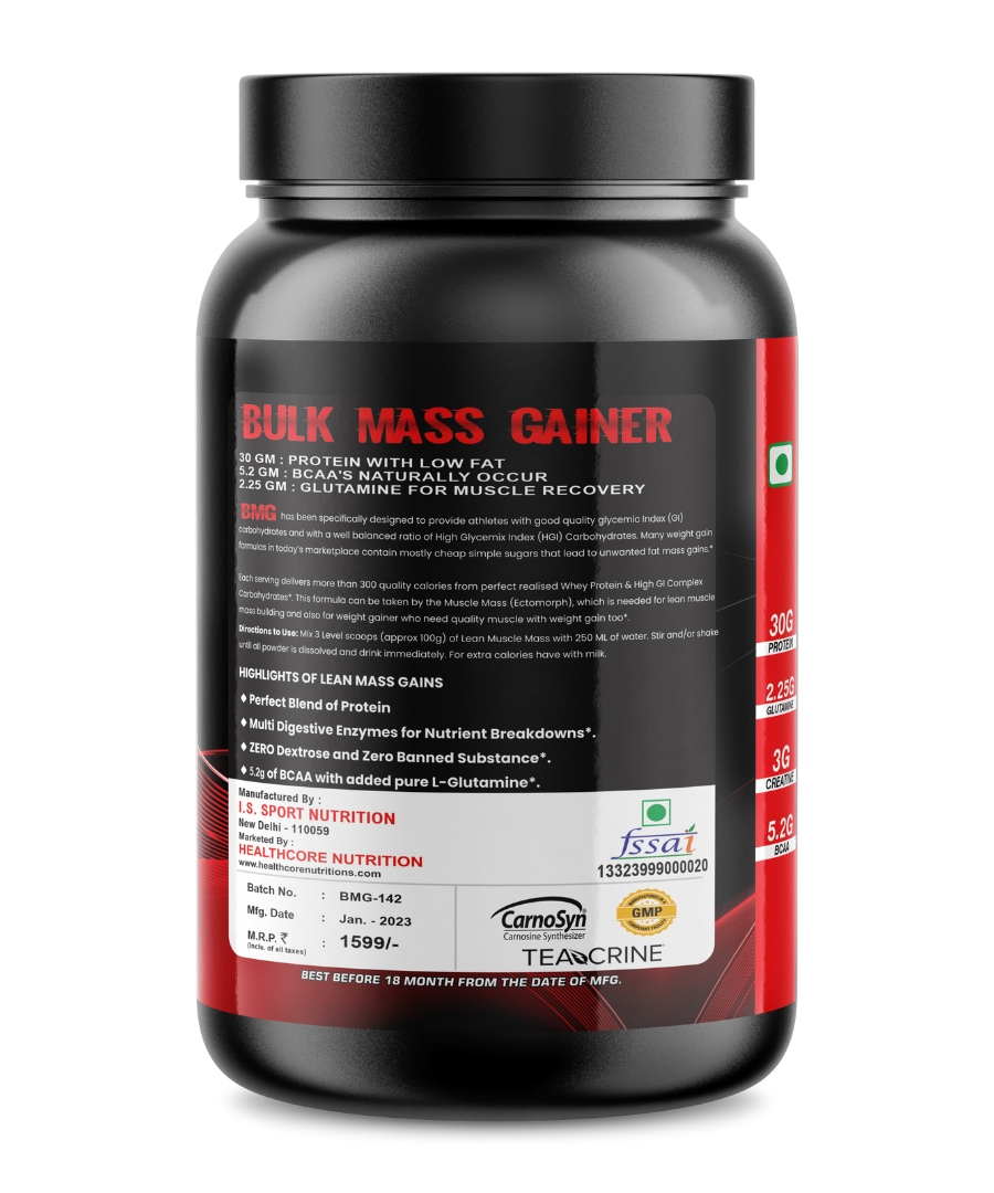Health Core Nutrition Bulk Mass is an advanced and effective weight gain supplement. It helps in the synthesis of new muscle gains and prevent post workout muscle loss. Added digestive enzymes helps in quick digestion of nutrients. Each serving provides 30 grams of protein and 892 calories.