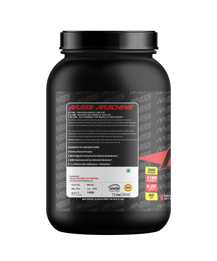 Health Core Nutrition Mass Machine is an advanced and effective weight gain supplement. It helps in the synthesis of new muscle gains and prevent post workout muscle loss. Added digestive enzymes helps in quick digestion of nutrients. Each serving provides 30 grams of protein and 1180 calories.